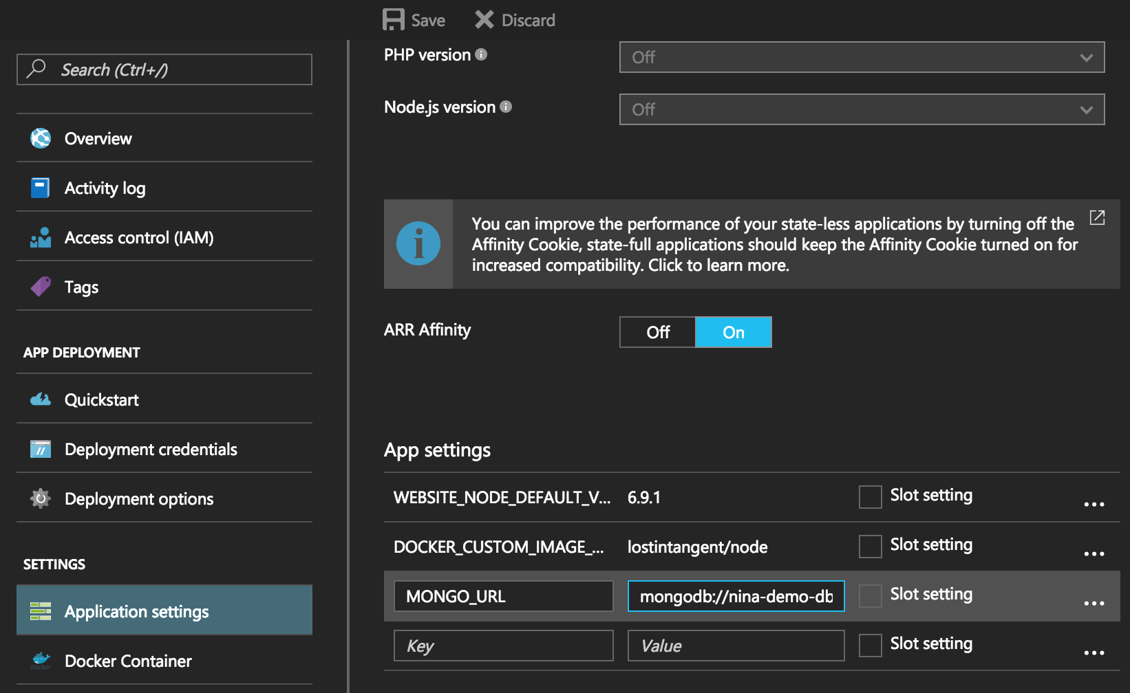Return to the All Resources page within the portal, and navigate to the App Service instance you previously created. Click the Application Settings menu item underneath the Settings section, and add a new entry underneath the App settings section, whose key is MONGO_URL and whose value is the DocumentDB connection string that we previously copied.