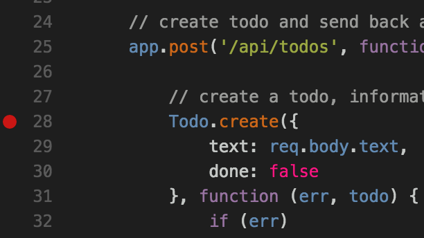 Let's set a breakpoint on line 28, which represents the Express route that will be called when our app tries to add a todo. To set a breakpoint, simply click the gutter to the left of the line number within the editor: