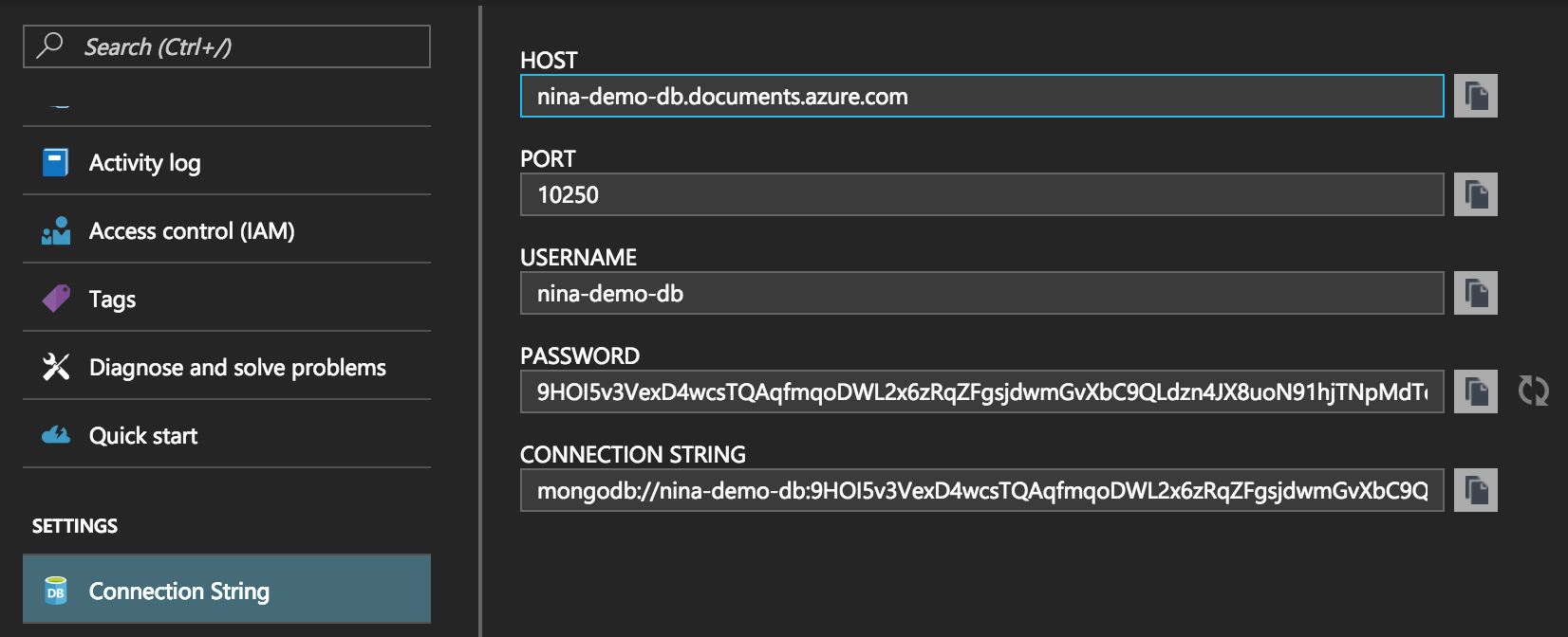Click the Connection String menu item underneath the Settings section, and then click copy button next to the Connection String field in order to copy the MongoDB connection string to your clipboard.