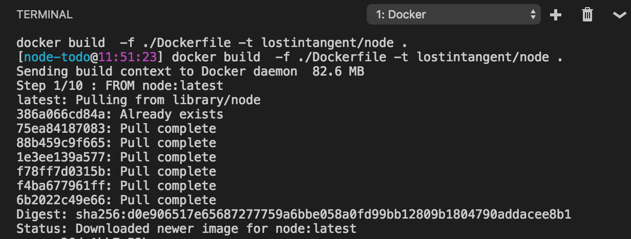 Now that we have our Dockerfile, we need to build the actual Docker image. Once again, we can use a command that the Docker extension installed, by typing F1 and entering dockerb (using "fuzzy search"). Select the Docker: Build Image command, choose the /Dockerfile that we just generated/edited, and then give a tag to the image which includes your DockerHub username (e.g. lostintangent/node). Hit <ENTER>, which will launch the integrated terminal window and display the output of your Docker image being built.