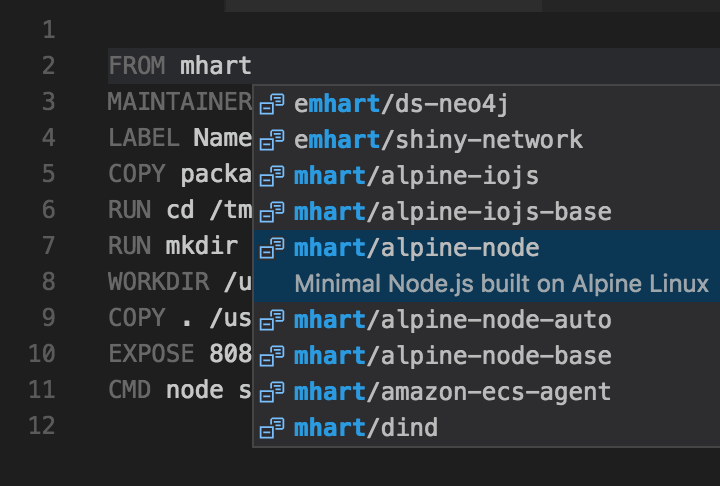 With your cursor after the t in mhart, hit CTRL+Space to view all of the image repositories that mhart has published on DockerHub.