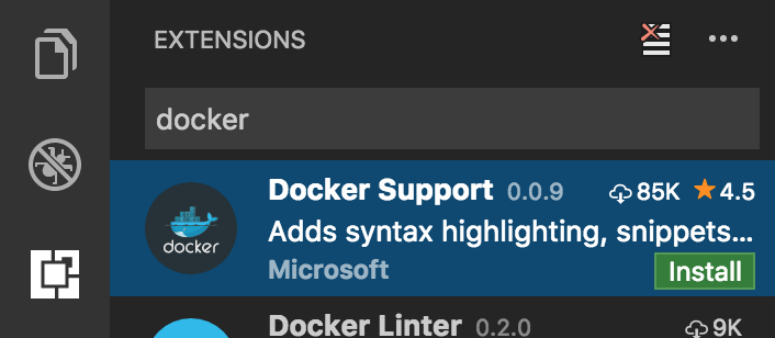 Switch back to the extensions tab, search for docker and select the Microsoft Docker extension. Install it and then reload VS Code, just like we did for the Chrome extension above.