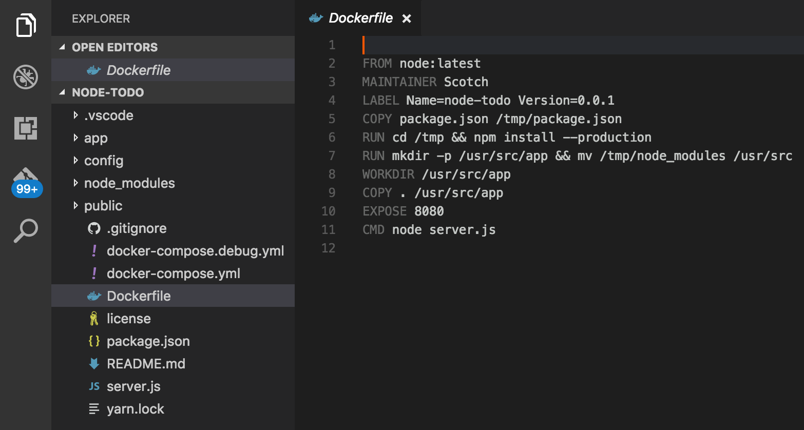 The Docker extension also provides auto-completion for your Dockerfiles and docker-compose.yml files, which makes authoring your Docker assets a lot simpler. For example, open up the Dockerfile and change line 2 from: