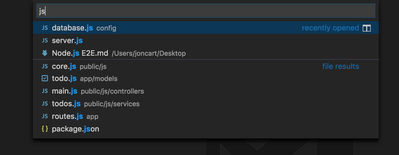 CMD+Pand enter.js, which lets you see all of the JavaScript/JSON files in the project, along with the directory they're within. Once again, this dialog supports the same "fuzzy search" as the command palette, so it's pretty flexible.