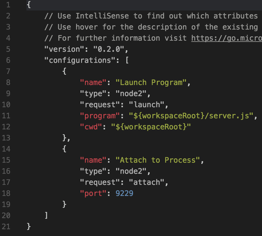 Select Node.js v6.3+ (Experimental), which will use the new Chrome Debugging Protocol support that was recently added to Node.js. Doing this generates a new file in your project called launch.json, which simply tells VS Code how to launch and/or attach to your app in order to debug it.
